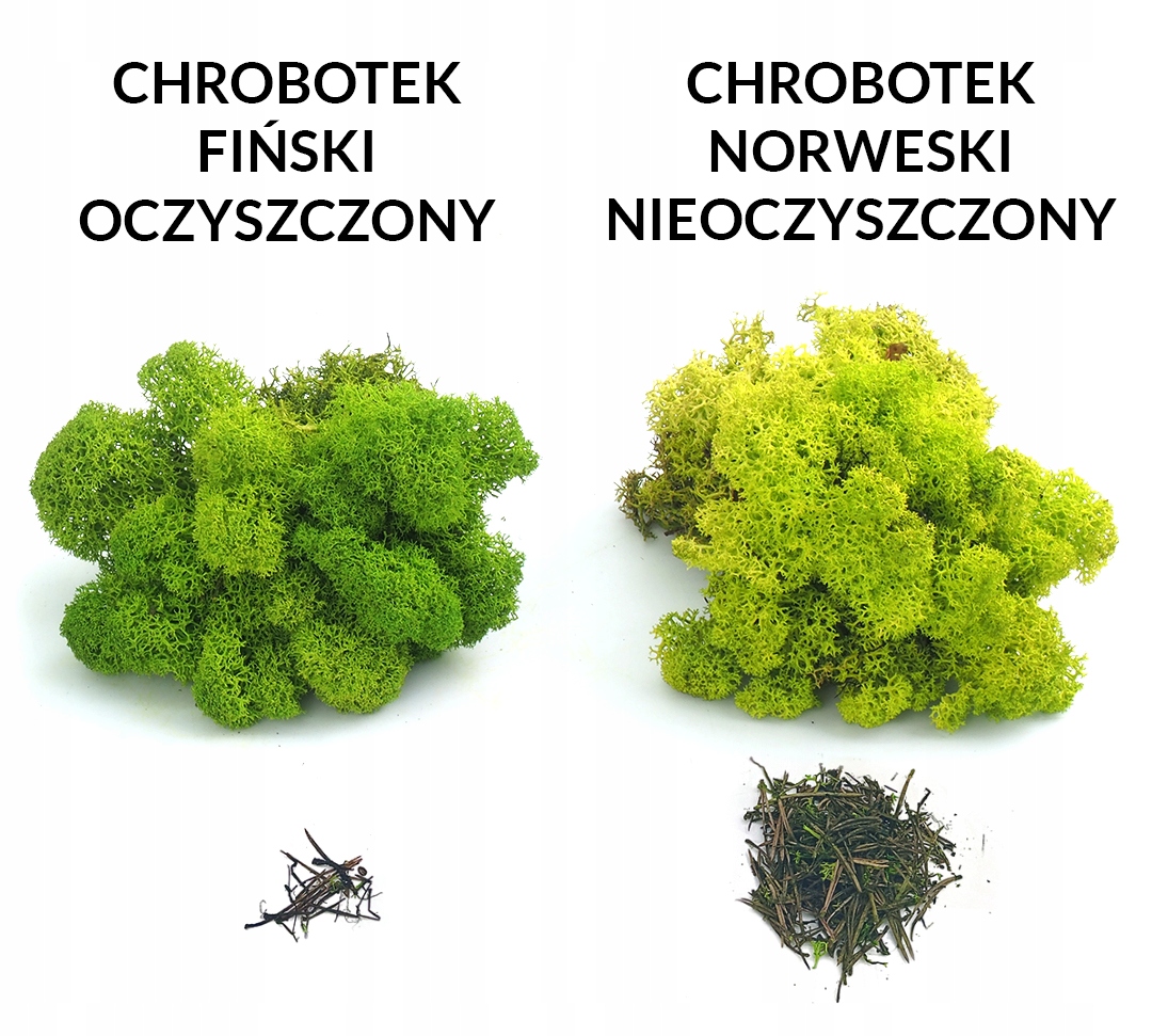 Наш мох є 100% натуральним продуктом. Він був підданий природному процесу просочення, щоб зберегти свою ніжну, м'яку структуру протягом багатьох років. Світло-зелений колір він отримав в результаті фарбування препаратами природного походження. Завдяки легкості нанесення мох може використовуватися як декор при створенні різноманітних виробів, таких як зелені стіни, картини з мохом або композиції в горщиках. Норвезький мох - це неочищений мох, що на практиці означає, що його необхідно очистити від кореневого шару. Очищений мох – це фінський мох – також доступний у нашій пропозиції.