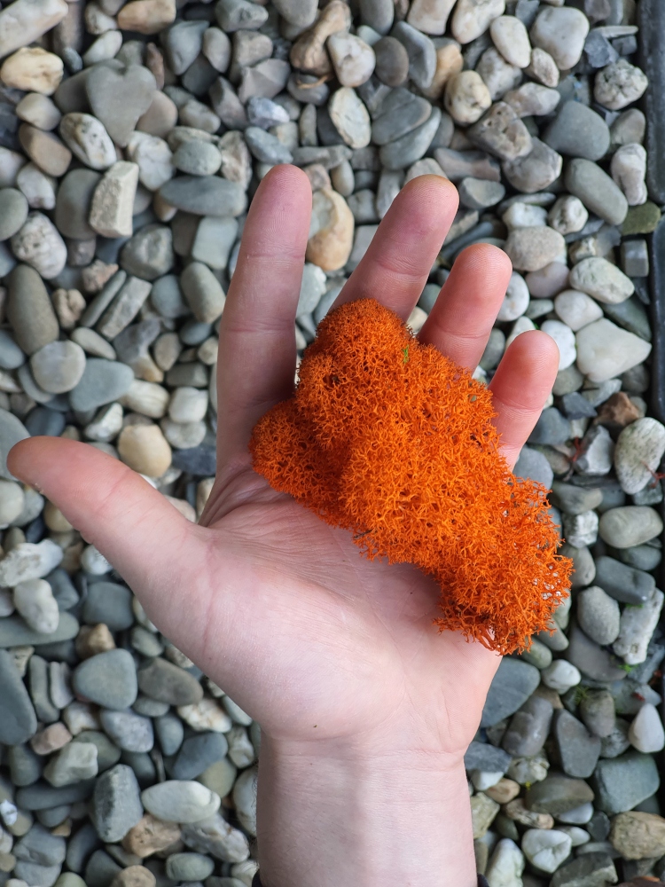 Стабілізована помаранчева розкладачка з яскравим кольором осіннього іржавого відтінку. Якісний лишайник, з малою кількістю домішок у структурі. Товар упакований в картонну коробку 300г в один шар, естетично оформлений. Мох чистий і готовий до роботи після вилучення з коробки. Урожайність однієї коробки моху хроботка 300г становить від 0,04 до 0,05 м2 поверхні (до 25х25 см).