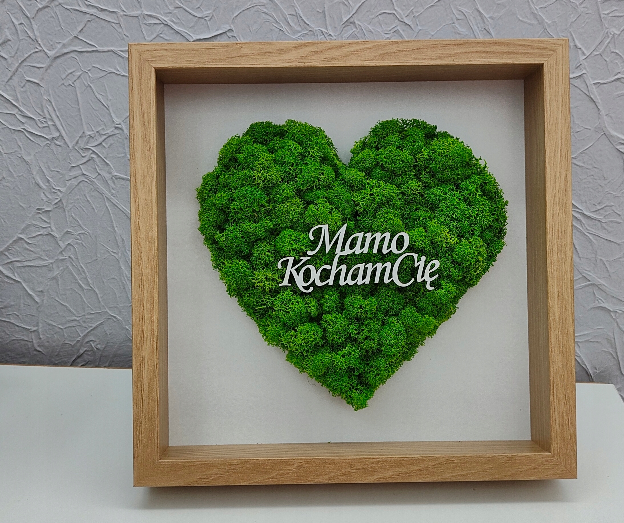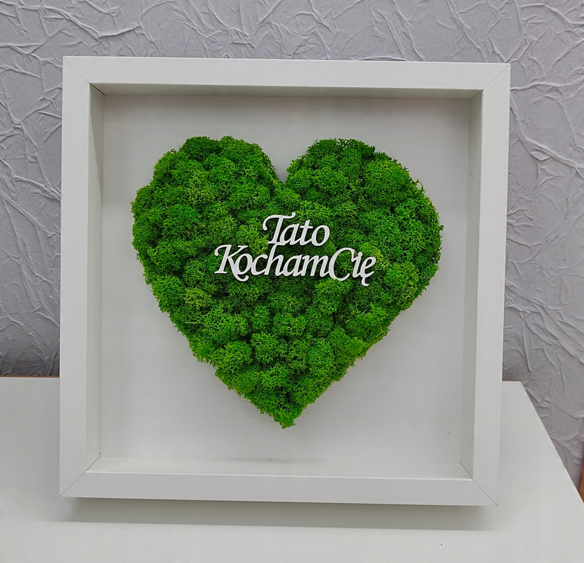 Живе серце з фінського моху з будь-яким написом на ваш вибір, поміщене в білу рамку, стане чудовим подарунком до Дня Матері чи Батька.