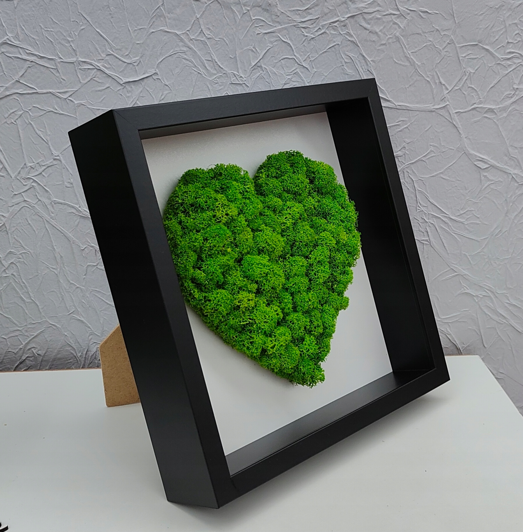 Мохове серце, день матері, день батька, моховий хроботек, глибока рамка, 25х25, чорна рамка