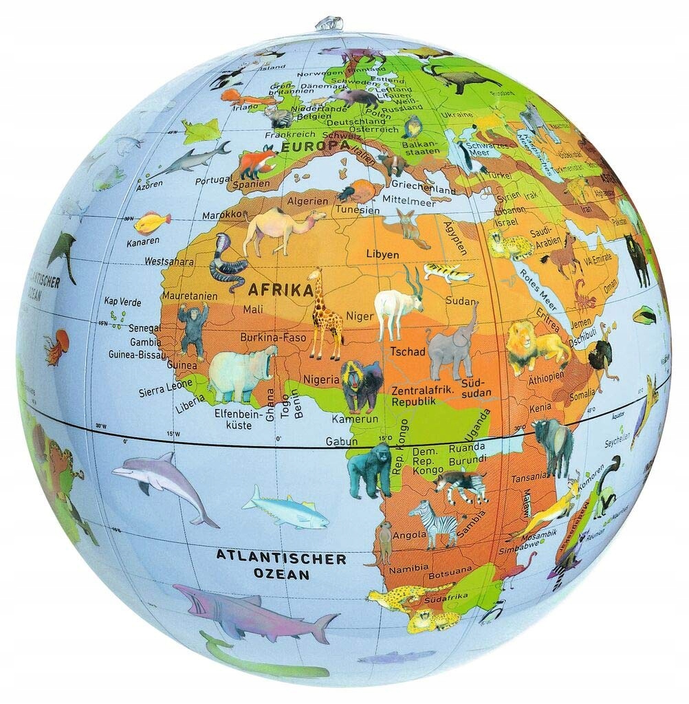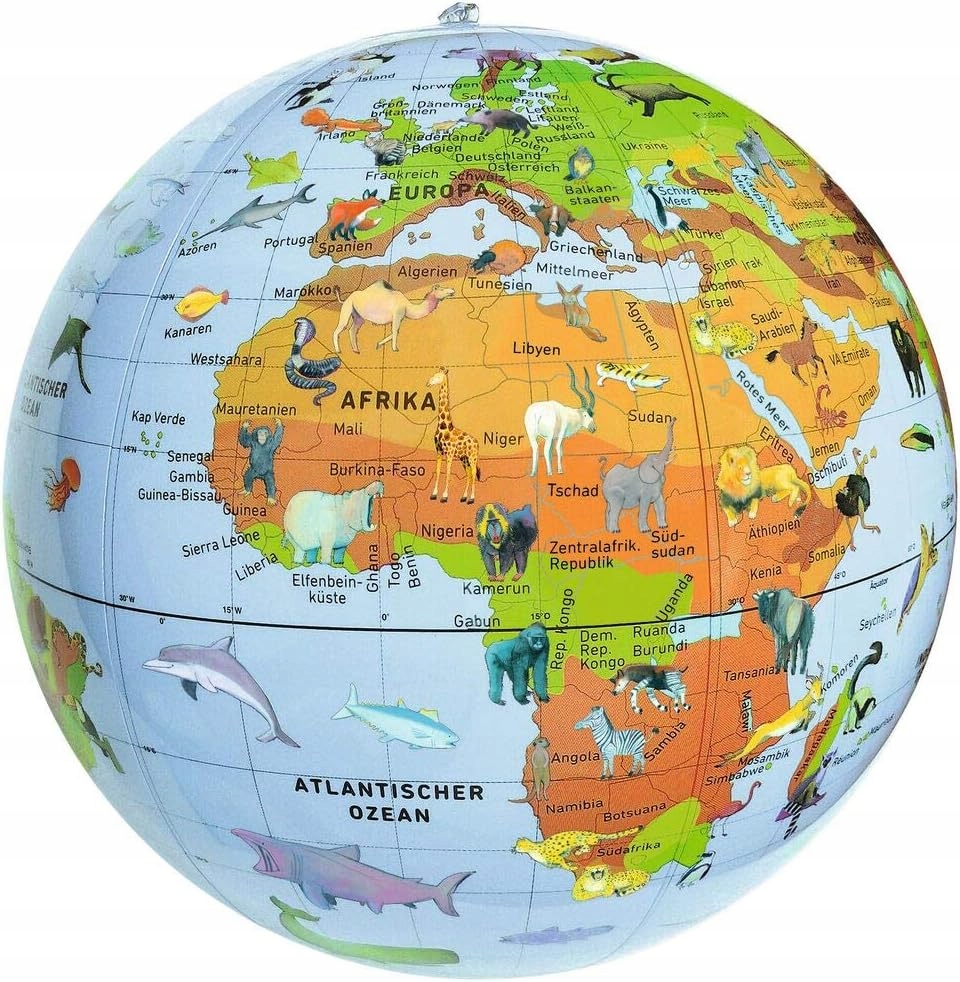 Просто чудова тварина! Цей прекрасний глобус для дітей - ідеальний подарунок для маленьких та великих шанувальників тварин. Де живе леопард? Які тварини існують у Південній Америці? А хто живе у Великому морі світу? Інформація про континенти, моря та 175 тварин жителів цієї землі передається кумедним способом. Завдяки цьому земна куля забезпечує розваги та знання. Водяну кулю можна легко транспортувати у пляжному мішку, після надувного діаметра близько 32 см. Напис - німецькою мовою. Використовуйте лише на мілководді під наглядом дорослих