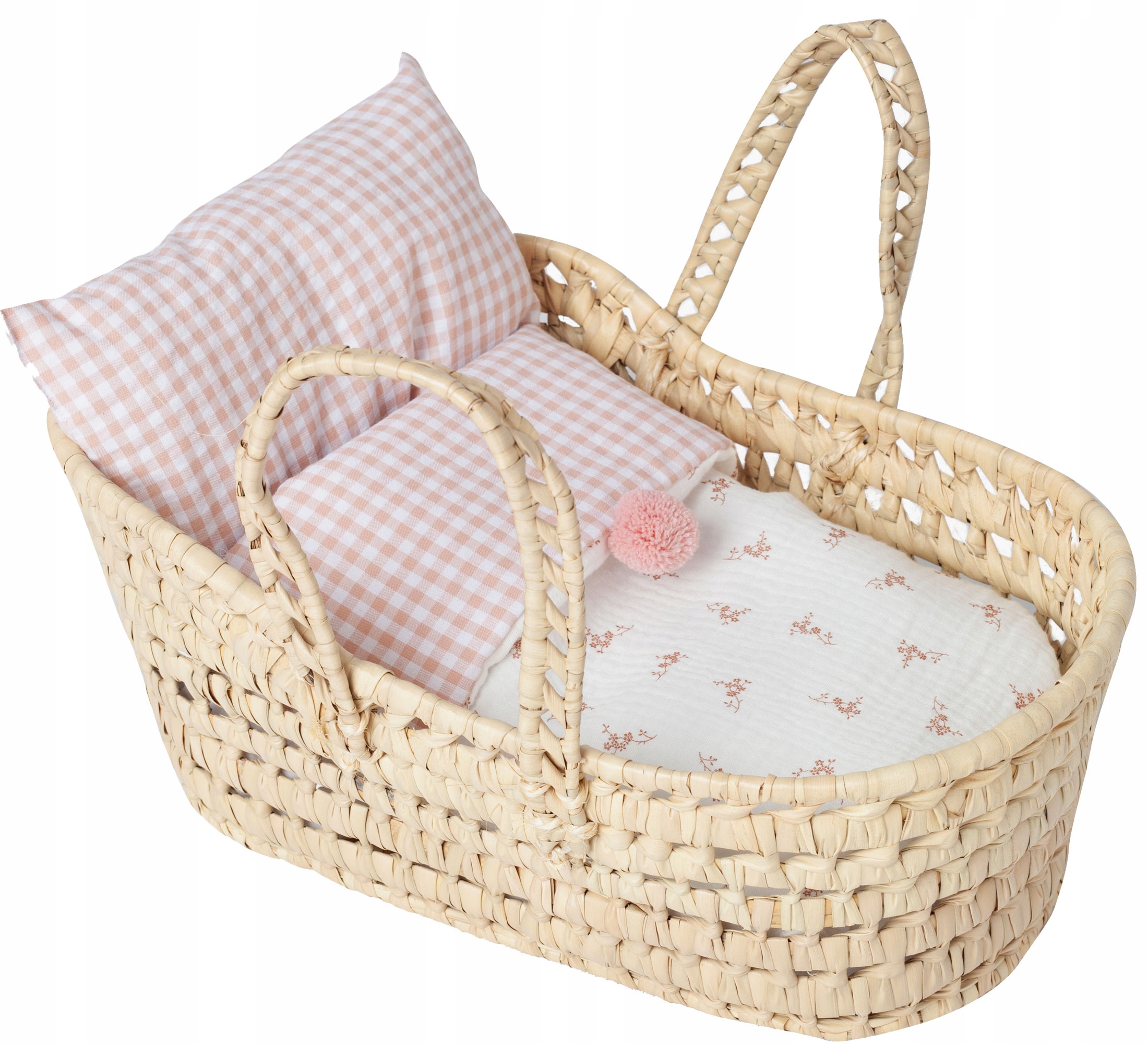 аксесуар легкий, твердий і довговічний. З сьогоднішнього дня ваша улюблена лялька матиме місце для сну. Кошик Мойсея оснащений двома зручними ручками, завдяки якому його можна перемістити в будь -яке місце. Крім того, наповнення кошика є постільною білизною мотивом квітами та подушкою подушкою.