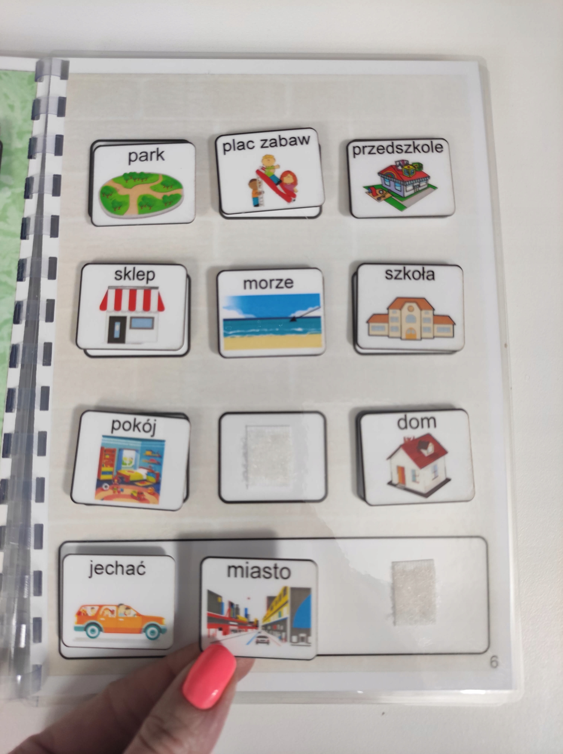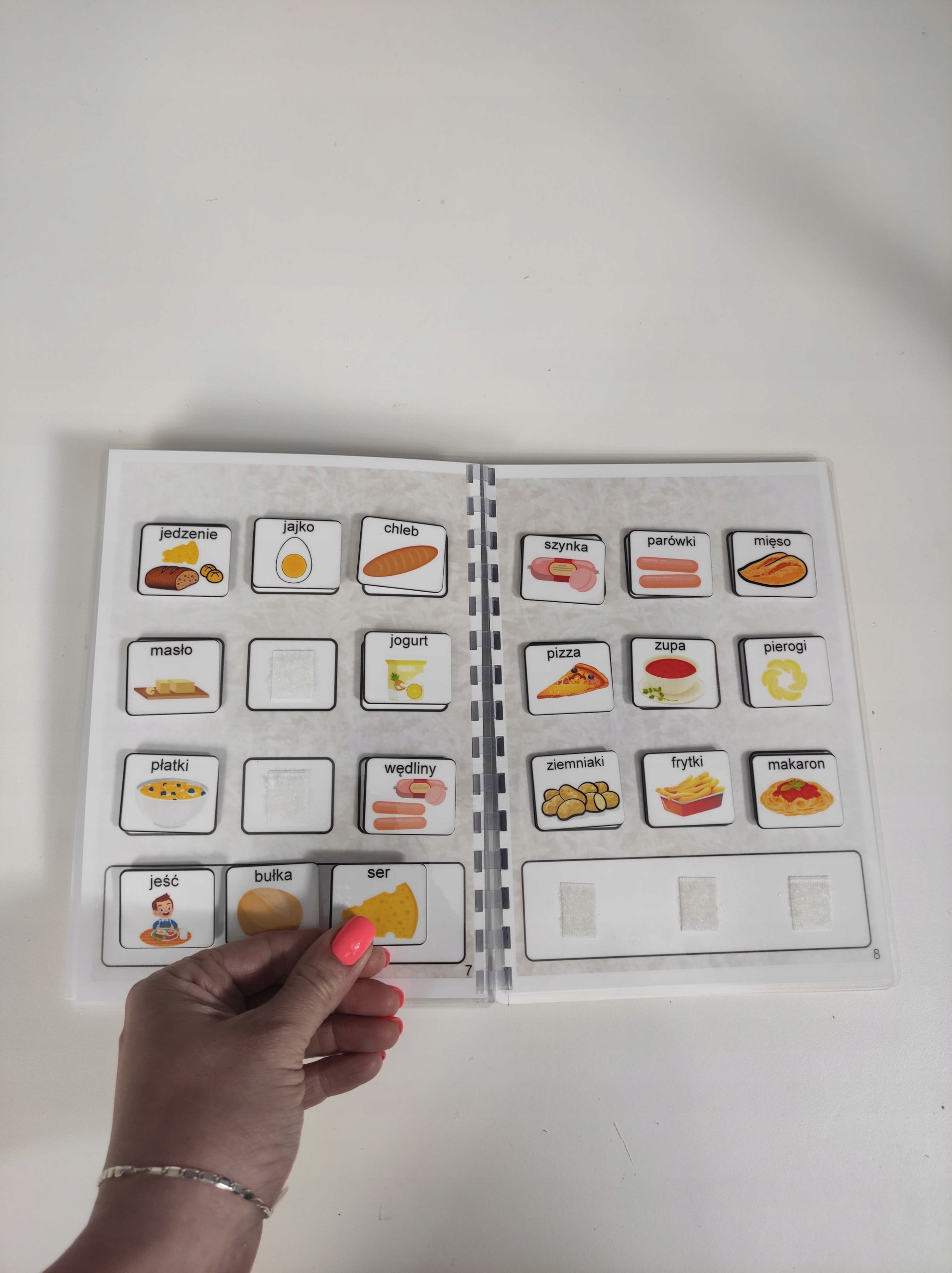 Книга формату А5, ламінована, переплетена липучкою (після вибору варіанту). Його можна персоналізувати за допомогою імені та фото дитини. Містить 10 сторінок завдань, загалом 90 піктограм, у тому числі: діяльність, вирази, місця, їжа. Існує версія для хлопчика/дівчинки на вибір.