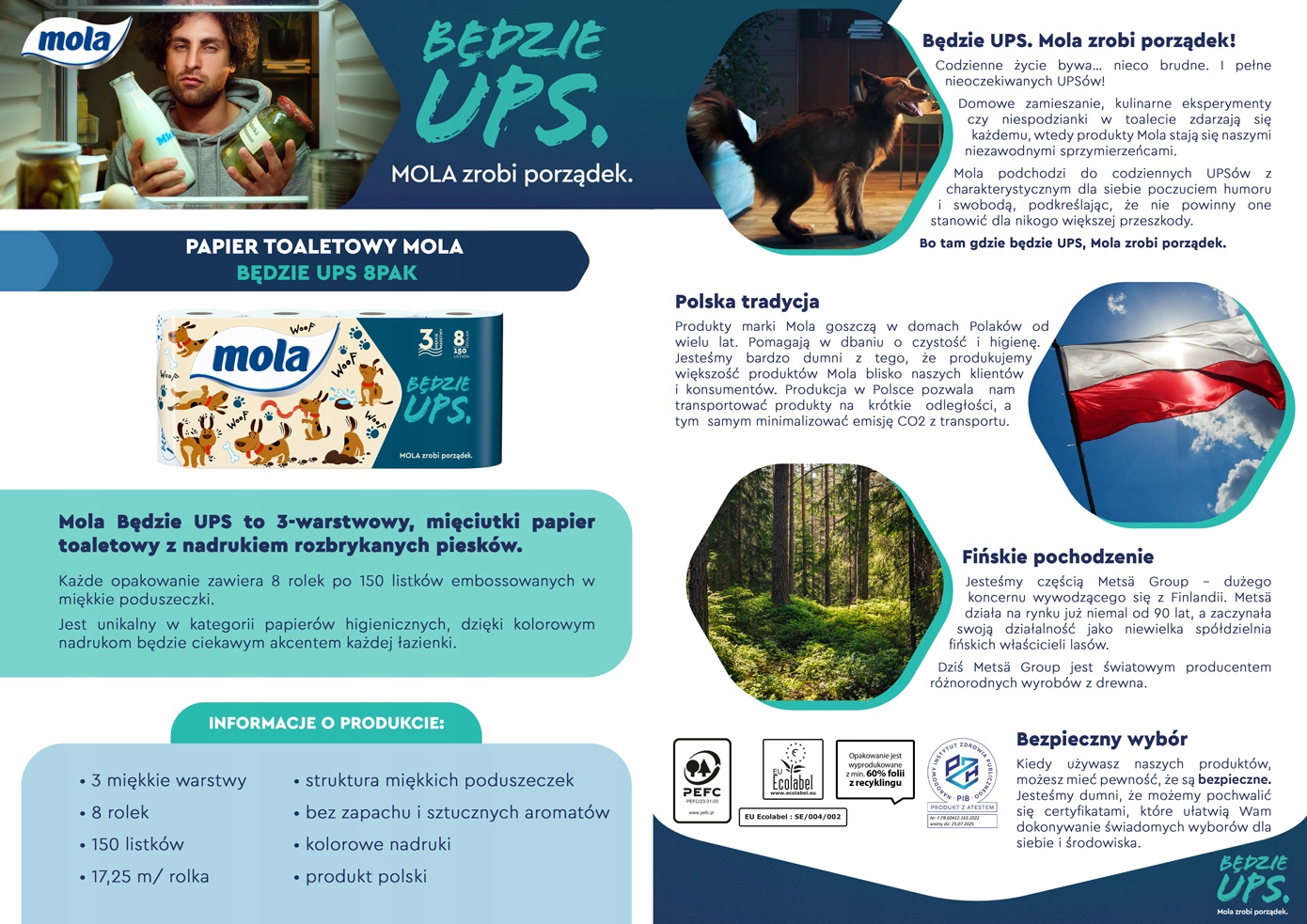Тришаровий туалетний папір Mola «Буде UPS», що поєднує в кожному аркуші м'якість, довговічність та екологічність. Наш туалетний папір — ідеальний вибір для тих, хто цінує комфорт і дбайливе ставлення до навколишнього середовища.