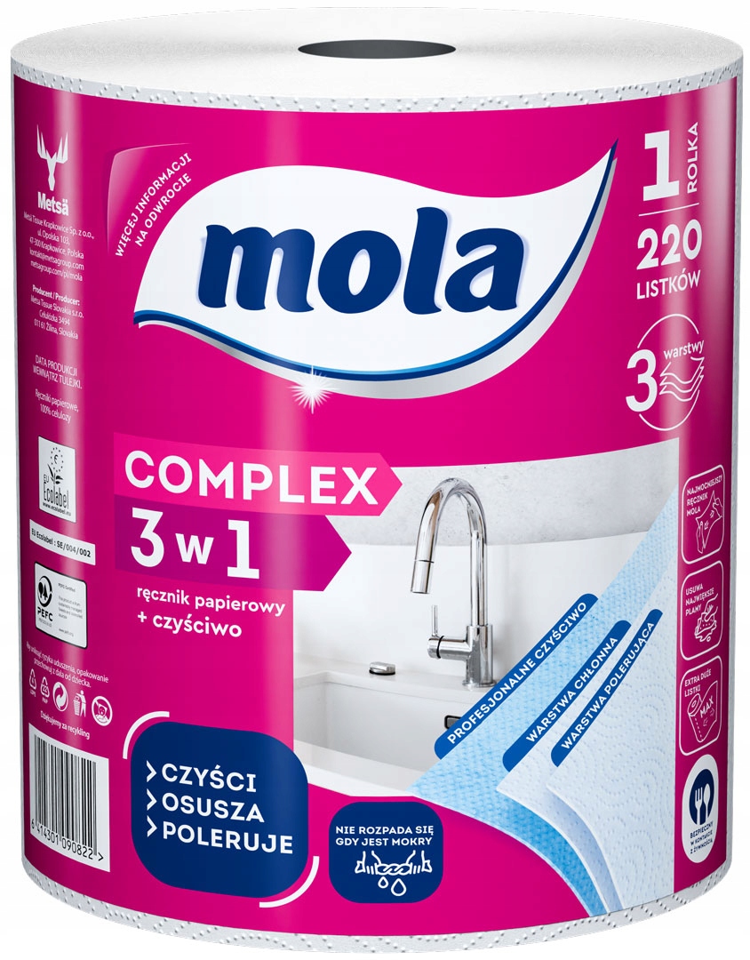 Познайомтеся з новим рушником Mola Complex 3in1 - революційним поєднанням міцної паперової тканини для чищення з двома шарами абсорбуючого паперового рушника. Це інноваційне рішення на ринку, яке забезпечує неперевершену універсальність і продуктивність.