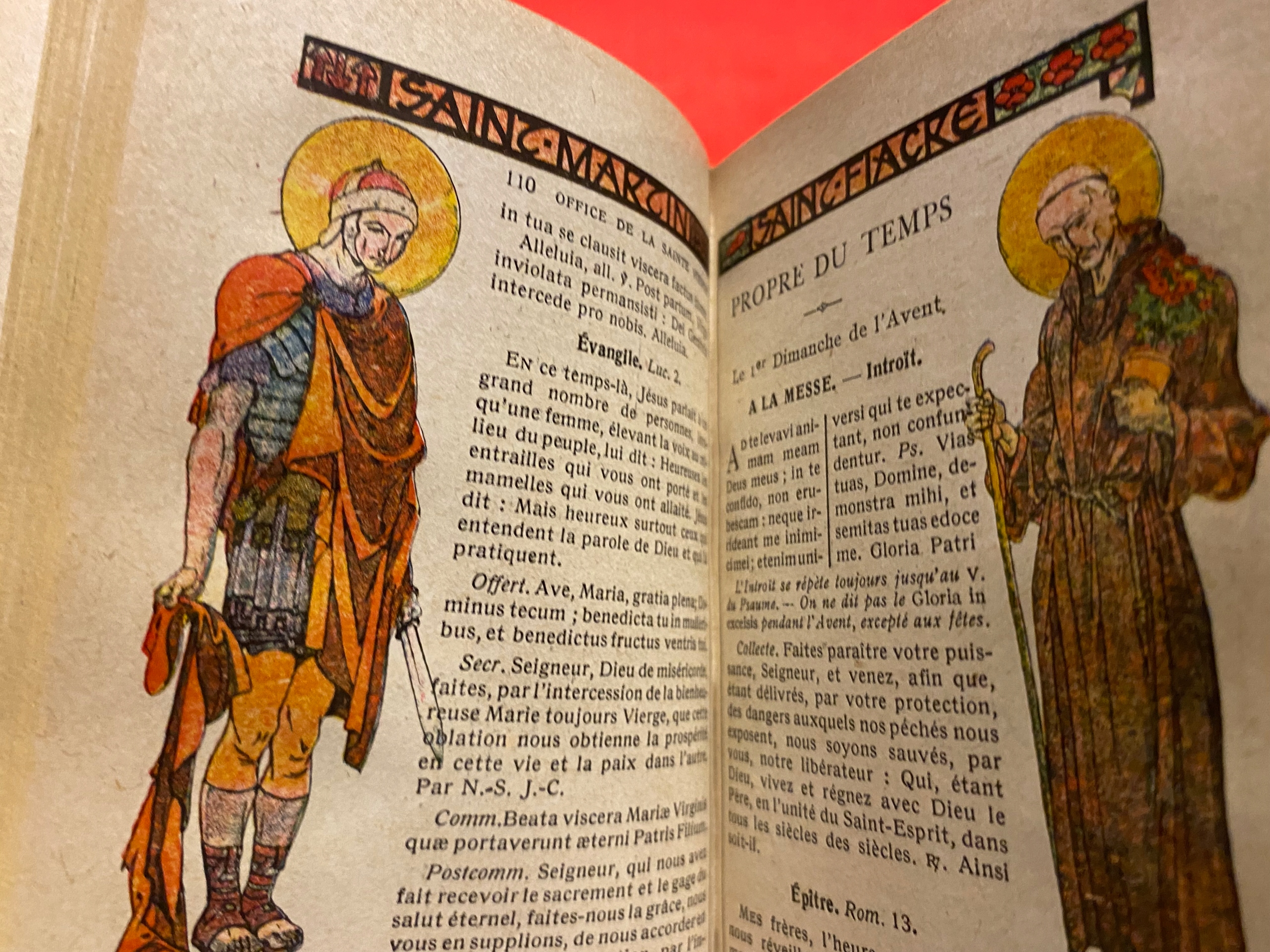 Предметом аукціону є красивий старий молитовник французькою та латинською мовами (missel des saints patrons), молитовник до святих покровителів, виготовлений у Ліллі, 1943 рік, містить чудові ілюстрації святих, на ілюстраціях зображені фігури святих з їхніми атрибутами, наприклад Свята Цецилія, Свята Анна, Святий Йосиф, Свята Варвара (я рекомендую це як чудове навчальне джерело) у шкіряній палітурці