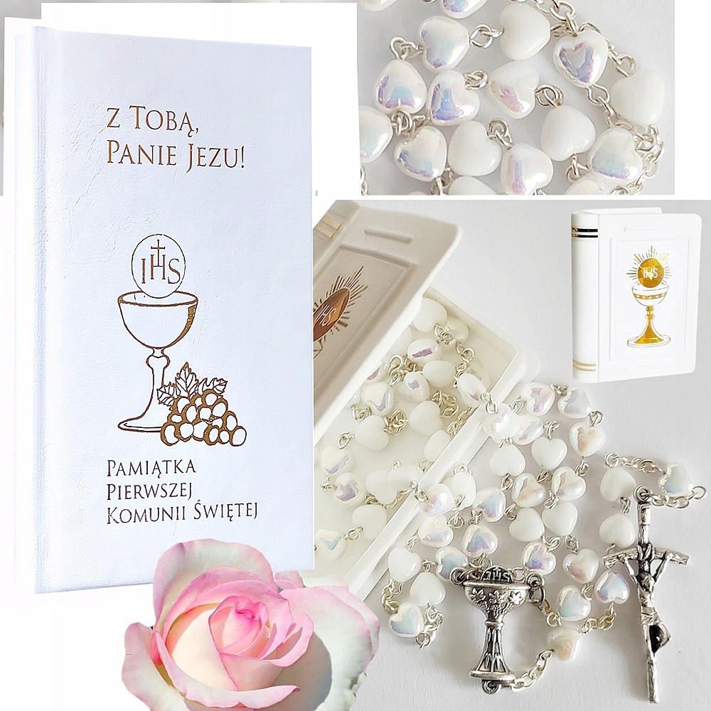 ЧУДОВИЙ РОЗАРІЙ ДЛЯ ПРИЧАСТЯ - БІЛІ РАЙДУЖНІ СЕРЦЯ - У КОРОБЦІ У ФОРМІ КНИГИ + МОЛИТОВНИК З ЧУДОВИМИ ФОТОГРАФІЯМИ В СЕРЕДИНІ