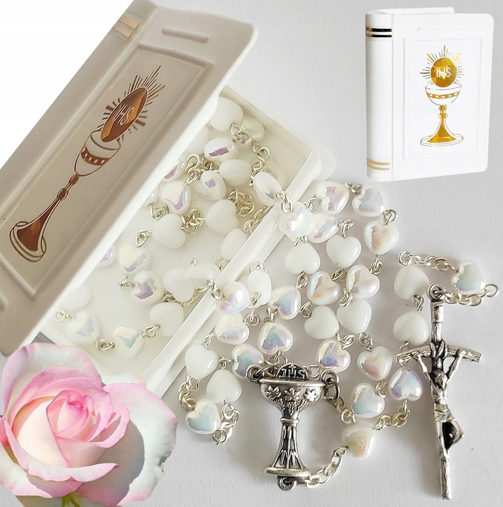 ЧУДОВИЙ РОЗАРІЙ ДЛЯ ПРИЧАСТЯ - БІЛІ РАЙДУЖНІ СЕРЦЯ - У КОРОБЦІ У ФОРМІ КНИГИ + МОЛИТОВНИК З ЧУДОВИМИ ФОТОГРАФІЯМИ В СЕРЕДИНІ