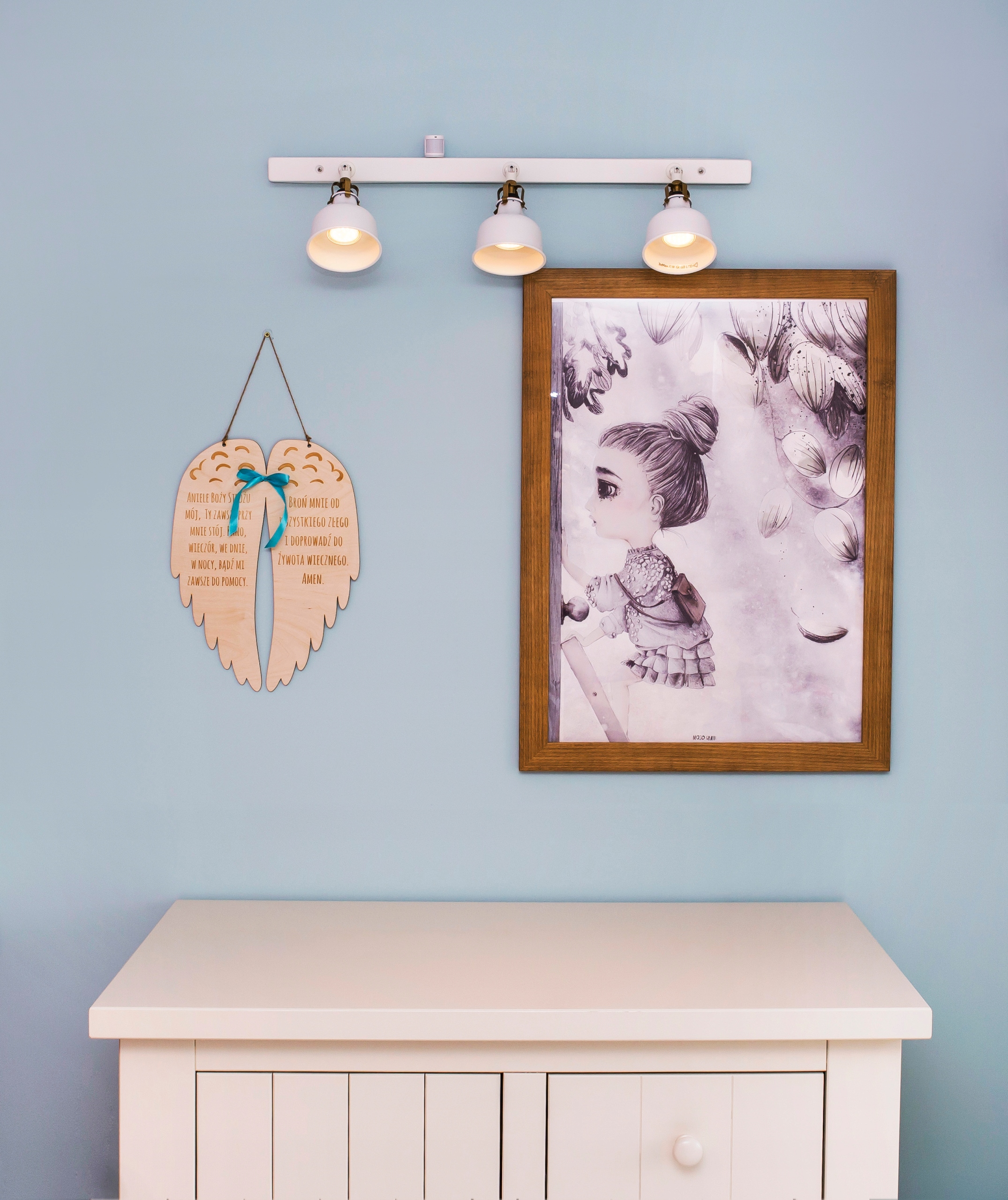Представляємо вашій увазі витончену велику підвіску у вигляді крил ангела. На крилах вигравірувана молитва до Ангела-Охоронця. Крила мають 2 отвори для шнурка, завдяки чому їх можна повісити над ліжком дитини. Додатково в крилах є 2 отвори для декоративної стрічки. Друк виконується лазерною технікою, що дає унікальний кінцевий ефект