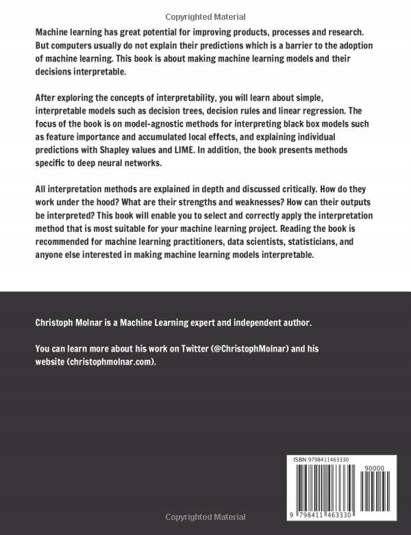 Ця книга охоплює цілий спектр методів, що інтерпретуються, від по суті інтерпретаційних моделей до методів, які можуть зробити будь -яку модель інтерпретацію, наприклад, Shap, Lime та Permutation важливі. Він також включає методи інтерпретації, характерні для глибоких нейронних мереж, і обговорює, чому інтерпретація важлива для машинного навчання. Усі методи інтерпретації демонструються глибоко і критично обговорюються. Як вони працюють під капотом? Які їх сильні та слабкі сторони? Як можна інтерпретувати їх результати? "Що мені подобається в цій книзі, це те, що вона починається з підстави великої картини занурення негайно в прискіпливість методів (хоча все це теж є)". - Андреа Фарнхем, дослідник Швейцарського інституту тропічного та громадського здоров'я