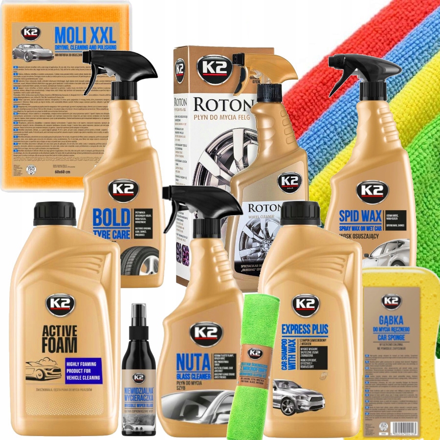 Цей широкий набір косметики та аксесуарів k2 - це все, що вам потрібно для всебічного та ефективного догляду за кожною деталізацією вашого автомобіля. Він включає активну піну K2 Active Poam з приємним запахом, K2 Express Plus Wax Shampoo, , а також м'якою губкою K2, , що забезпечує ніжне, але ефективне промивання кузова автомобіля. За допомогою рідини для k2 Rims roton та блиску для жирних шин k2, ваші колеса відновлять заводський вигляд та глибокий блиск. Набір доповнюється віконною рідиною K2 , яка гарантує гладку обробку та ідеальну видимість.