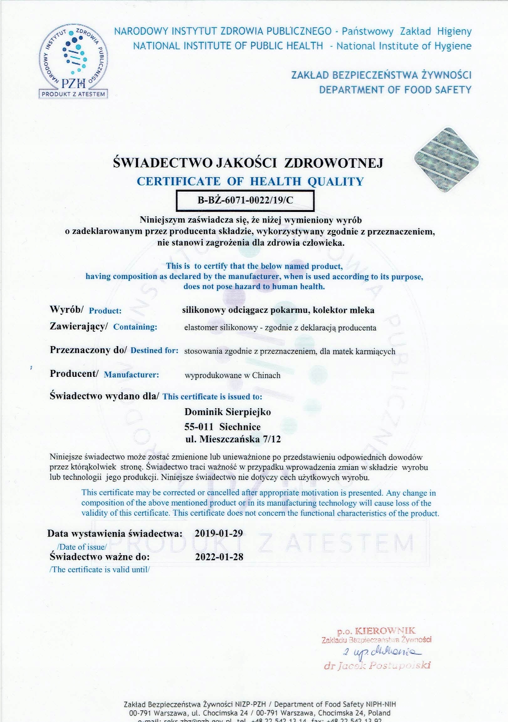 PN-EN 1186-1:2005 та PN- EN 1186-3:2005 для матеріалів і виробів, призначених для контакту з харчовими продуктами - підтверджено лабораторними дослідженнями, проведеними в Польщі! У лабораторії перевірили, чи не потрапили в молоко, що зберігалося в пляшці, якісь речовини, присутні в силіконі. Результат у 12,5 разів кращий за стандарти ЄС.