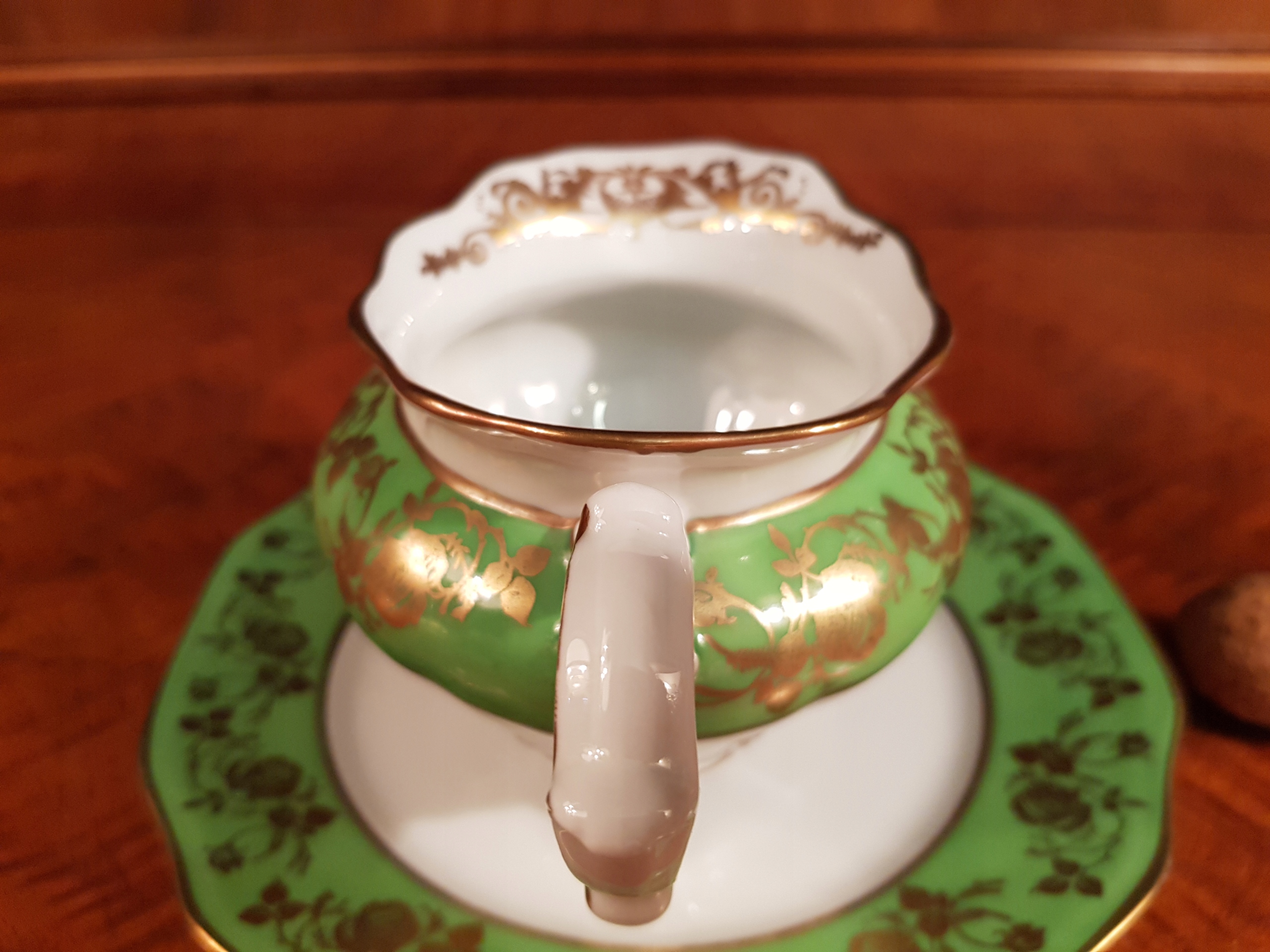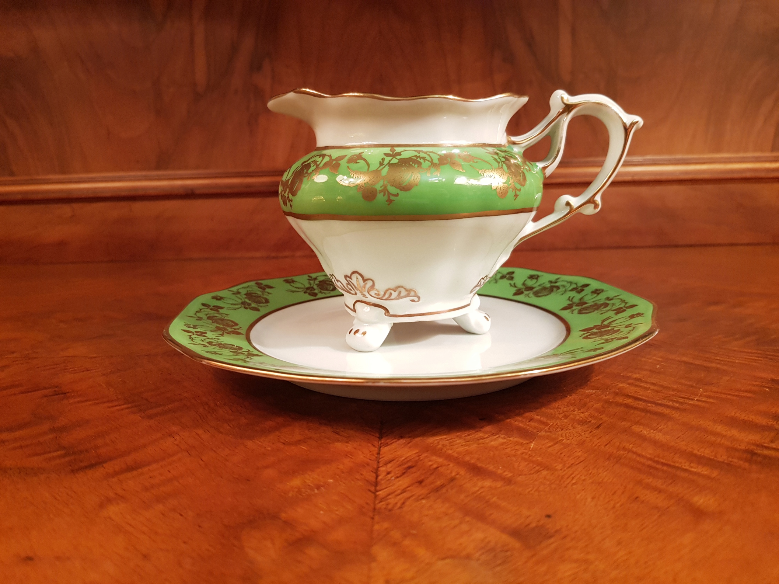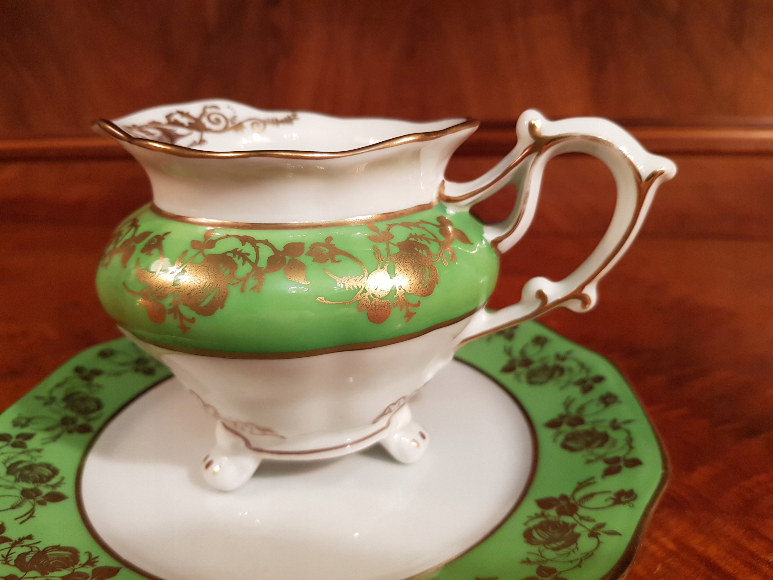 Біла порцеляна, прикрашена зеленою смугою з мотивом позолочених троянд.