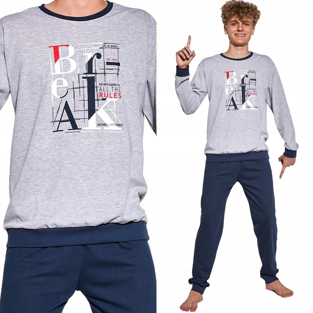 Молодіжна піжама для хлопчика від польського виробника торгова марка CORNETTE. Виготовлений зі здорової, приємної до тіла бавовни. Забезпечує максимальний комфорт під час вечірнього відпочинку та сну. Завдяки матеріалу та крою ідеально підходить для сезону осінь-зима. Комплект складається з двох елементів: сірої блузи з молодіжним принтом і довгими рукавами та темно-синіх довгих штанів з еластичним поясом. Піжама вільно облягає тіло, а приємний матеріал дозволяє шкірі дихати, забезпечуючи здоровий і безпечний сон, штанини і рукава оброблені зручними манжетами.