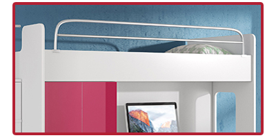 Ліжко характеризується сучасним дизайном і точною виготовленням, що забезпечує винятково хороший сон, а також безпеку і впевненість, що ваша дитина прокинеться відпочилою. Фасади гарнітура виготовлені з глянцевої меблевої плити МДФ насичених кольорів, що дозволить підібрати меблі до будь-якої кімнати. Верхня поверхня для сну та сходинки біля ліжка оснащені поручнями, щоб захистити дитину від випадання.