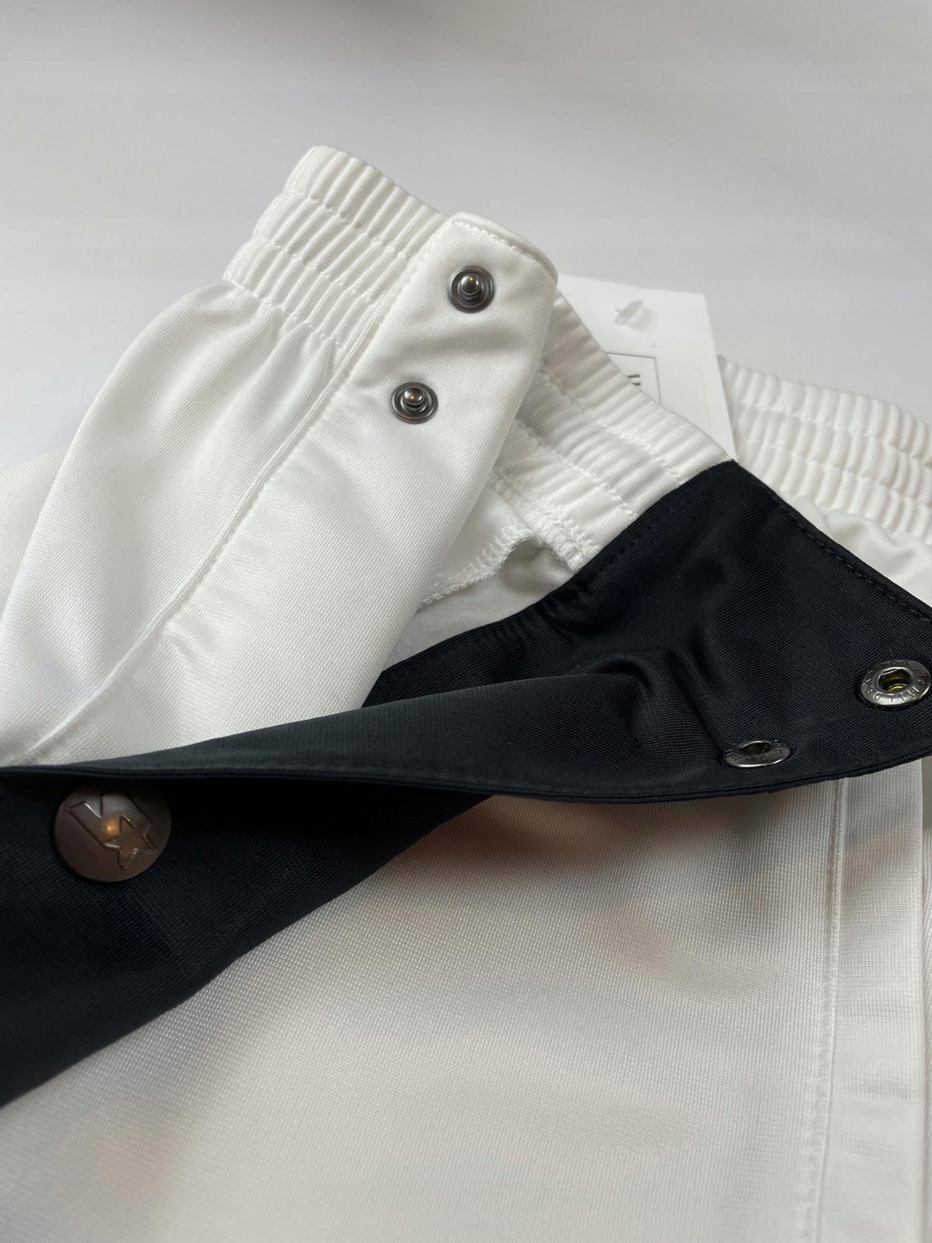 - Штани білі. З боків мають чорні тканинні вставки. Штани мають резинку. Ніжки по всій довжині скріплені застібками з підписами. Це характерно для баскетбольних штанів. Спереду мають дві класичні кишені. Вони мають чорний логотип компанії на правій штанині.