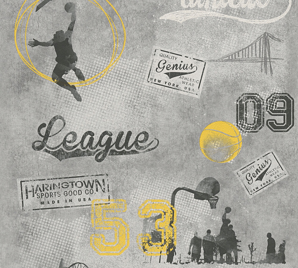 Сучасні дитячі та молодіжні шпалери із зображенням вуличного стилю, баскетболу сірого кольору з жовтими акцентами.