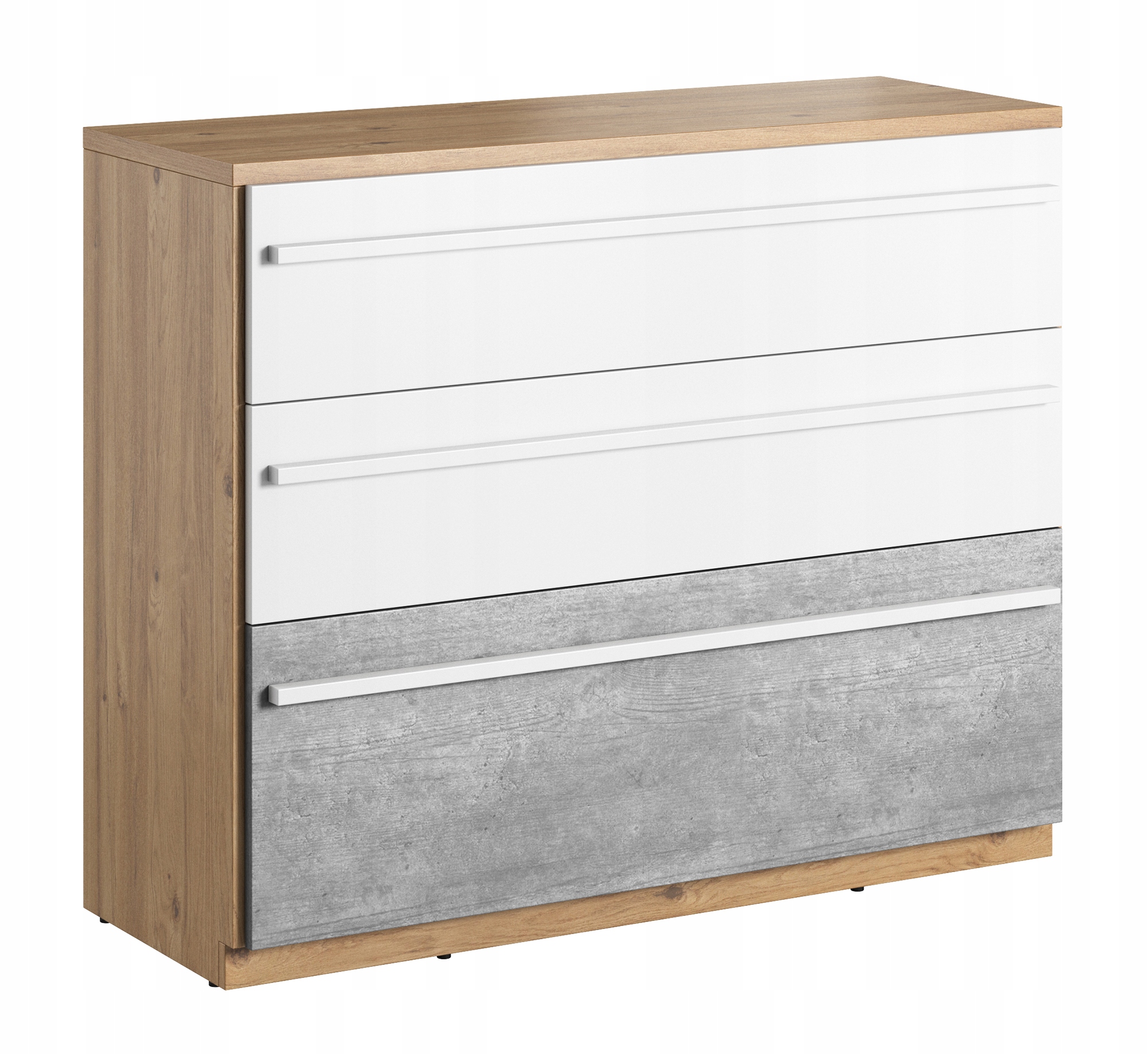 Модний комод з трьома місткими та легкодоступними ящиками. Усередині меблів ви знайдете багато місця для нижньої білизни, документів, наукових аксесуарів та інших дрібниць. Стиль меблів цікаво поєднує сучасність з ноткою традиції. Вічне поєднання білого і бетону робить комод затишним у будь-якому інтер'єрі. Модний дизайн привертає увагу b> масивний корпус, який також визначає каркас меблів. Меблі виготовлені з міцної ламінованої плити, обробленої міцною кромкою з АБС.