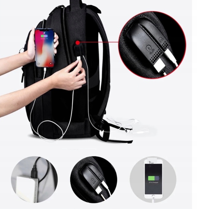 ✔️ Зовнішній USB-порт збоку рюкзака з вбудованим зарядним кабелемза допомогою якого можна зручно підключити павербанк і зарядити свій планшет або телефон,