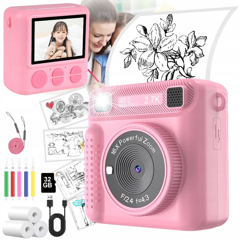 МОМЕНТАЛЬНА КАМЕРА РОЖЕВИЙ ТЕРМОПРИНТЕР РОЖЕВИЙ + 3 РОЛИКИ 12MP 1080P