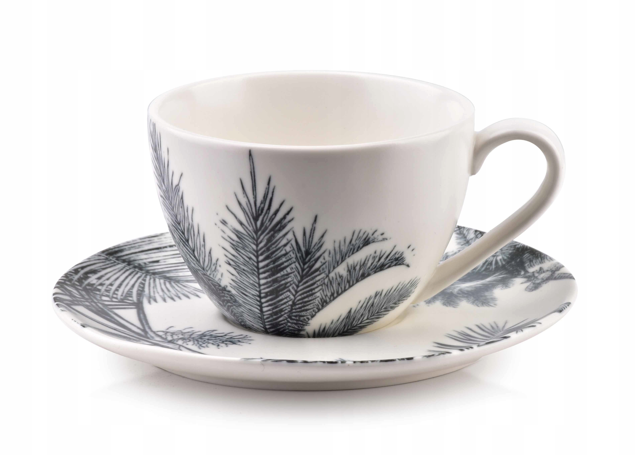 порцелянова чашка з тропічної серії Affek Design. Він має матове скління та біло-сірий малюнок. Ємність: 250 мл діаметра блюдця: 15,5 см висота чашки: 6,5 см діаметр вниз: діаметром 4,5 см. Верх: 9,5 см може бути промита в посудомийній машині та використовується в мікрохвильовій печі.