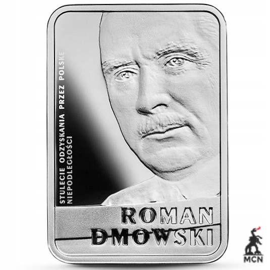 Ми представляємо монету, присвячену сторіччю відновлення Польщею незалежності, вшановуючи важливий внесок Романа Дмовського у відродження Польщі.