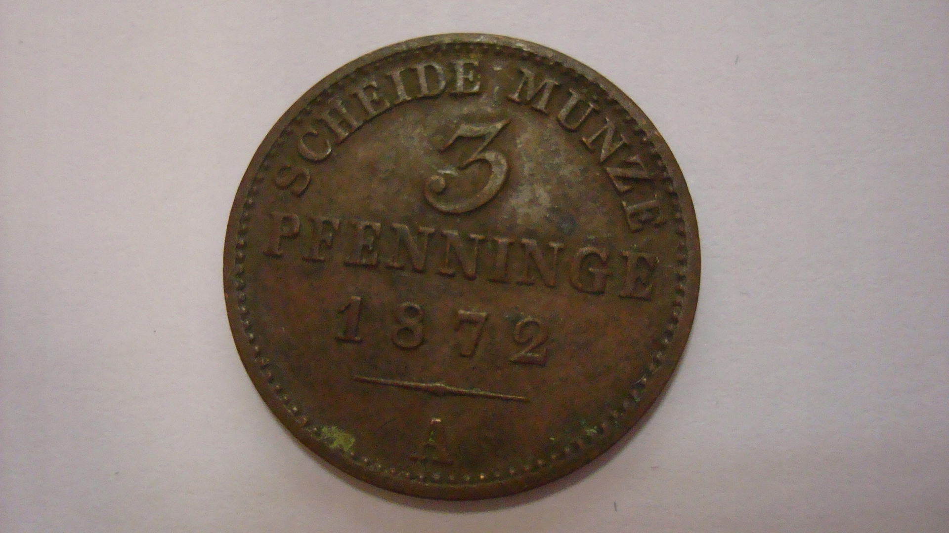 Moneta Prusy 3 fenigi, 1872 stan 3+
