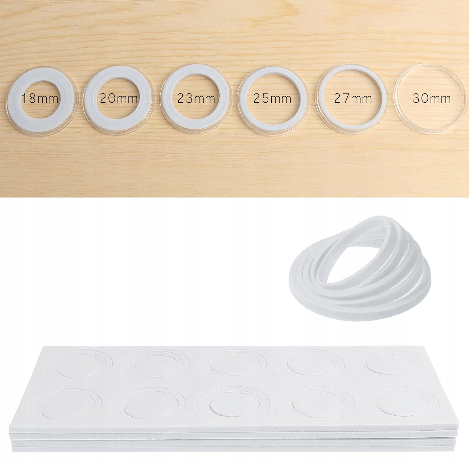 🪙【 Регульована прокладка пінопласту EVA】 упакована зі 100 приталеними прокладками для піни EVA, круглим та стійким до зносу внутрішнього кільця EVA регулюється, його можна регулювати залежно від розміру монети на 18 мм/20 мм/23 мм/27 мм/30 мм. Прокладки з піни допомагають утримувати монети на місці та добре захистити монети, заважаючи їм переміщувати та малювати. Дерев’яна монетна коробка є практичною для захисту капсул для монет, зберігаючи їх відсортовані та впорядковані.