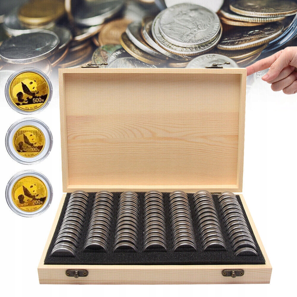 Розмір монетниці становить близько 280 x 190 x 45 мм, виготовлений із соснової деревини найвищої якості для зберігання 100 пластикових капсул для монет. Прозорі капсули для монет спрощують зберігання, перегляд і обмін монет. Дерев’яна коробка для зберігання монет практична та довговічна, чудово підходить для захисту капсул у вашій монетниці, зберігаючи їх акуратними та охайними.