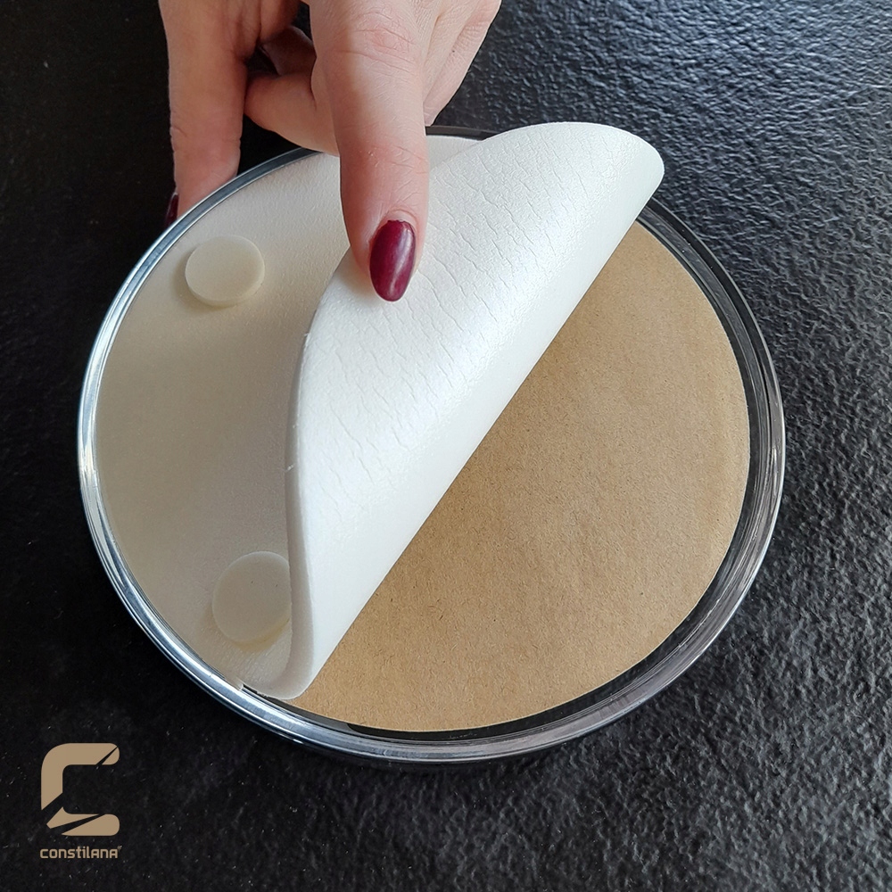 Підставка з вашим принтом для роздачі дуже міцне - стійке до подряпин скло (на відміну від пластику та полікарбонату, на яких подряпини помітні дуже швидко), на прокладках проти ковзання. З литого, профільованого скла. Його увігнутий меніск розміром 8 мм захищає монету від випадання.