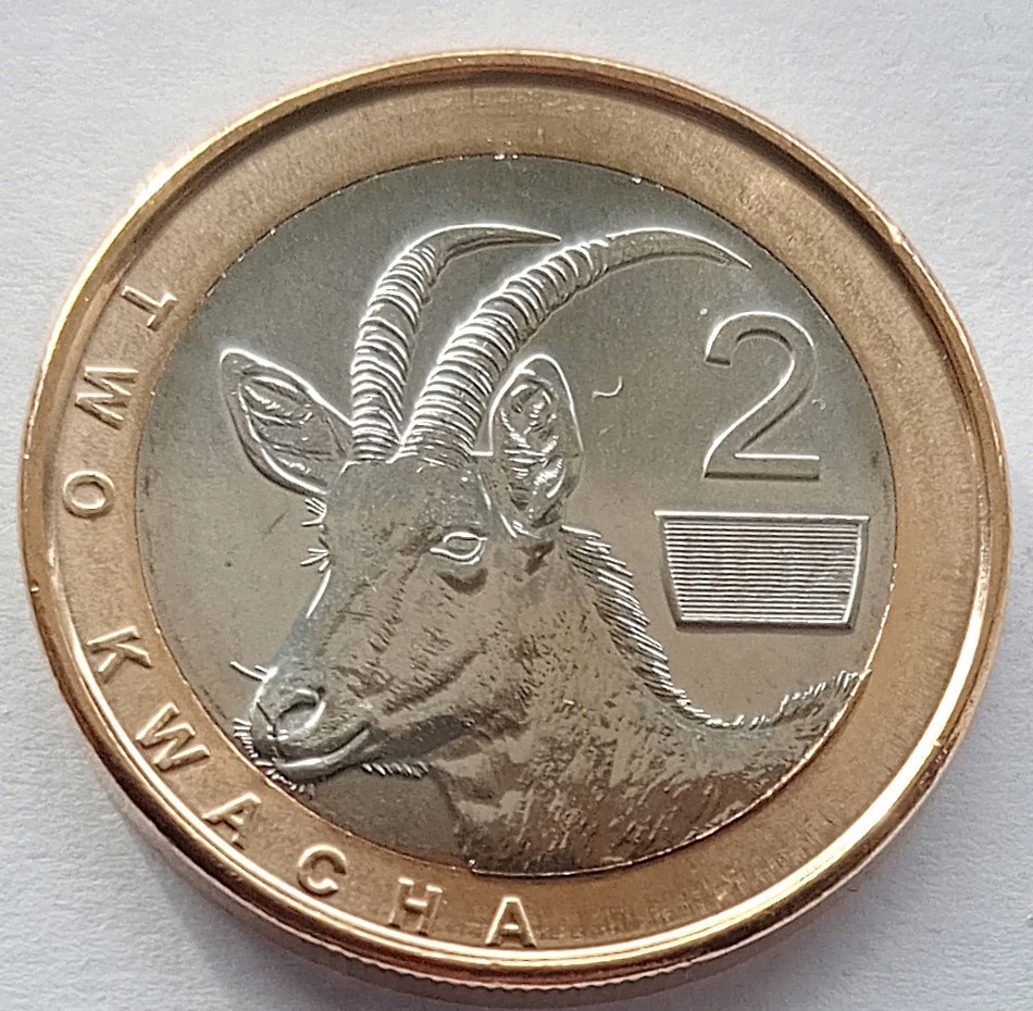Аверс: ліворуч голова кінської антилопи, праворуч номінал: 2, внизу приховане зображення: 2 BOZ. Значення в тексті: зліва внизу: DWA KWACHA