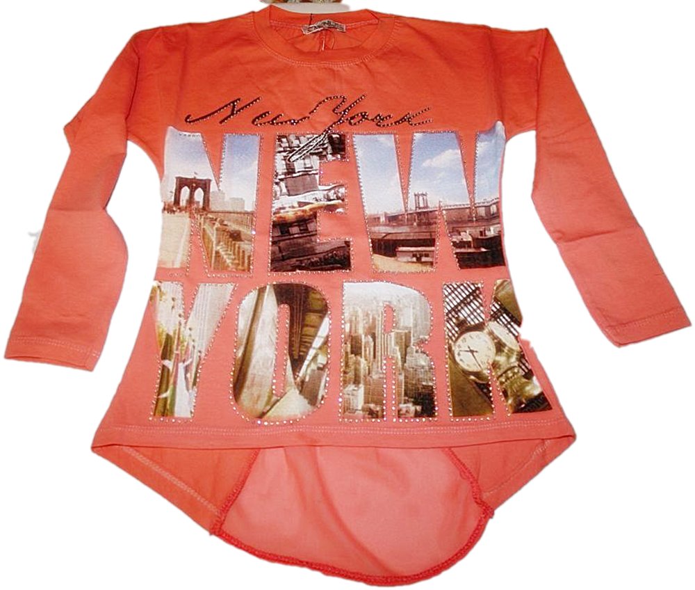 Виготовлена з бавовни. Спереду напис NEW YORK з різнокольоровими цирконами та картинками з міста. Ззаду вставка з помаранчевого тюлю.