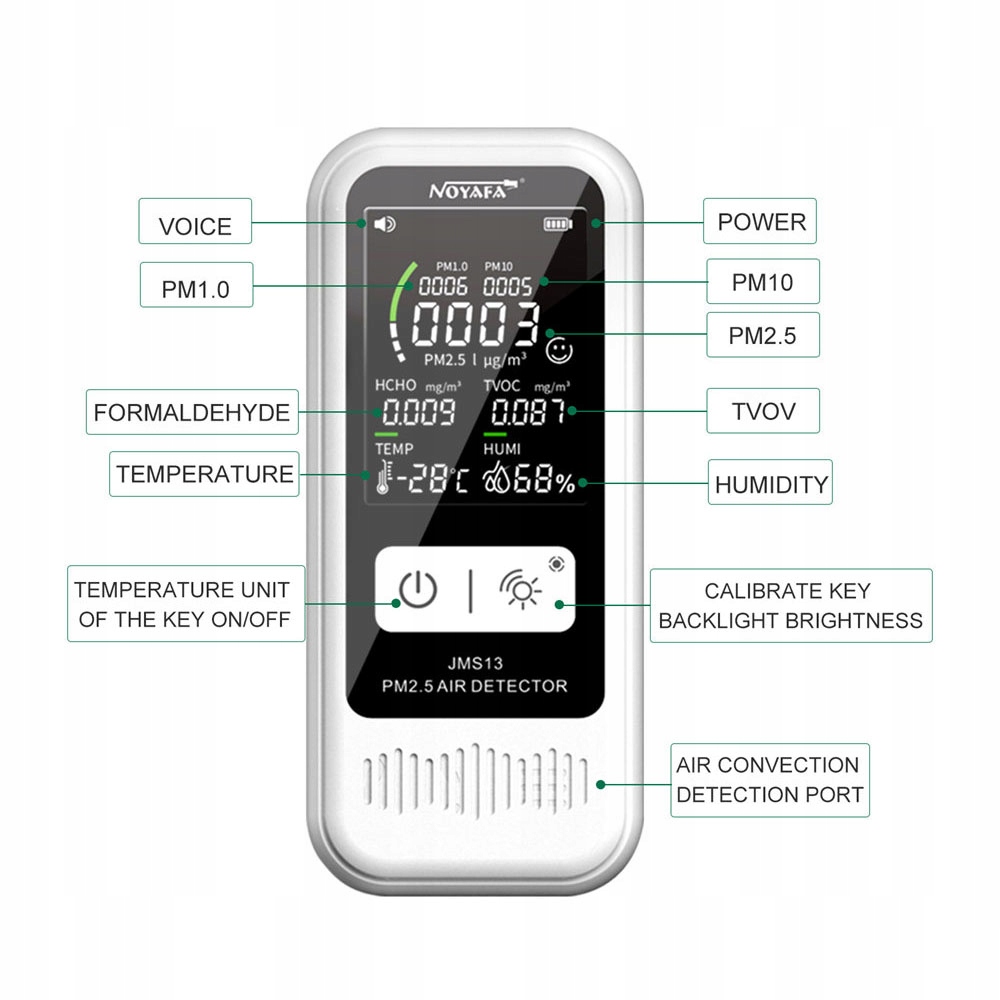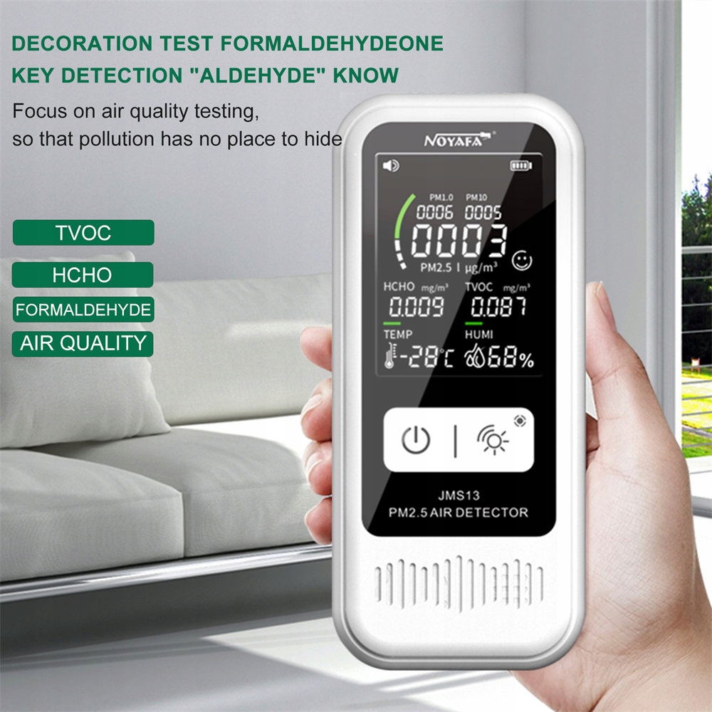 Завдяки цьому розумному пристрою ви можете бути впевнені, що перебуваєте в кімнаті зі сприятливими умовами та маєте повні знання про TVOC, HCHO, ФОРМАЛЬДЕГІД. TVOC (Total Volatile Organic Compounds) Загальна кількість летких органічних сполук – це гази, що виділяються певними твердими речовинами або сполуками, зокрема різними хімічними речовинами, які можуть накопичуватися у вашому домі. Не всі ЛОС шкідливі, багато ЛОС корисні. Наприклад, апельсини та кавові зерна виділяють ЛОС. HCHO - формальдегід є поширеним газом. Його часто використовують у меблевій, косметичній та швейній промисловості. Якщо в малих кількостях він має бактерицидну дію, то у великих кількостях він може виявитися сильно отруйною речовиною. Наші прилади для вимірювання формальдегіду дозволяють виявити високі концентрації цього газу та уникнути неприємних наслідків, пов'язаних з його вдиханням. Використовуючи прилади для вимірювання формальдегіду JMS-13, ви точно визначите якість повітря в окремих приміщеннях. Формальдегід також відомий як формальдегід, який є найпростішим з альдегідів. Найбільшими викидами формальдегіду є заводи з виробництва МДФ, ДСП і ДВП, а також клеїв, лаків і текстилю. Усі процеси згоряння деревини та викопного палива, тобто вугілля та вихлопні гази автомобілів, також є важливими джерелами викидів формальдегіду. Також не варто забувати про куріння сигарет, при якому також виділяється невелика кількість формальдегіду.