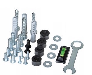 - В комплекті універсальний набір кріпильних гвинтів для телевізора, набір шурупів і настінних дюбелів, рівень