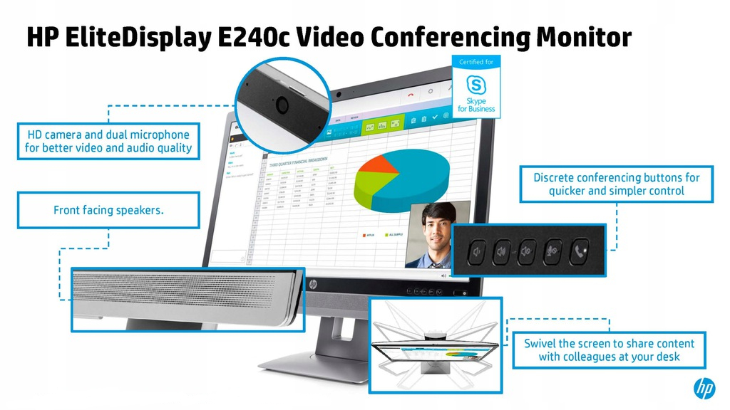 HP EliteDisplay E240c — це 23,8-дюймовий монітор Full HD, розроблений для користувачів, яким потрібна як висока якість зображення, так і вбудовані мультимедійні функції. Завдяки елегантному дизайну та функціям, які полегшують роботу, ця модель ідеально підходить для офісного середовища, відеоконференцій і повсякденних завдань.