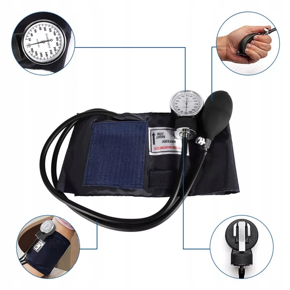 - ● Специфікація: містить антероїдний манометр, вентиляційний клапан та надувний куля. Набір включає стетоскоп 70 см та зручний, чорний мішок для зберігання