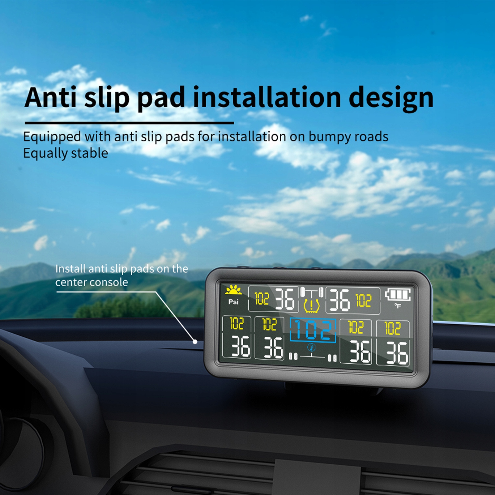 1. Монітор одночасно стежте за шістьма шинами: цей монітор тиску, що працює на шині, показує тиск і температуру шести шин, а також відстежує температуру автомобіля в режимі реального часу. На перший погляд всі ключові дані зрозумілі під час руху, допомагаючи залишитися у верхній частині транспортного засобу для безпечніших атракціонів!