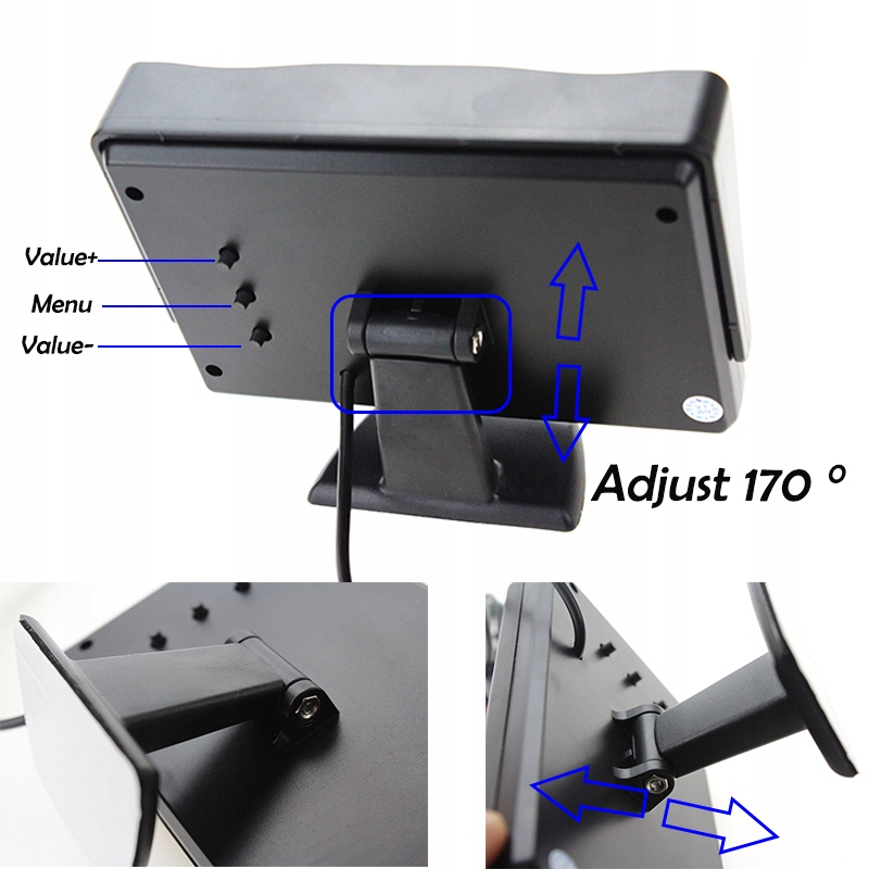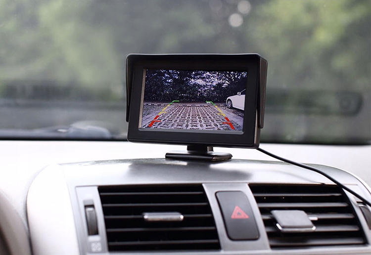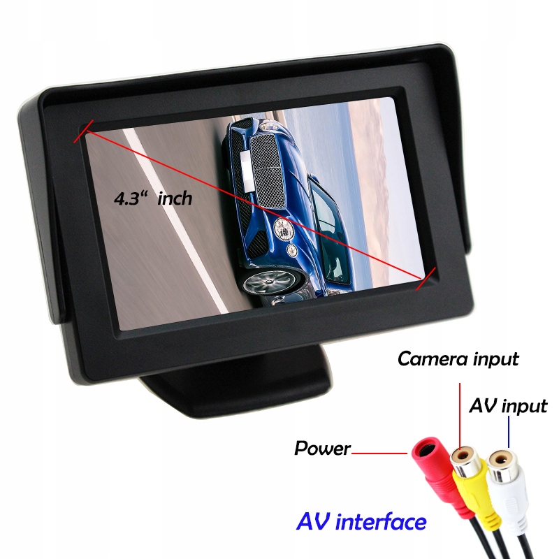 - - 4,3-дюймовий цифровий TFT РК-монітор для автомобіля 35 В постійного струму з 2-канальним входом відео. Вхід AV1 підключається до автомобільного DVD, VCD та іншої відеотехніки. AV2 підключається до камери заднього виду автомобіля.