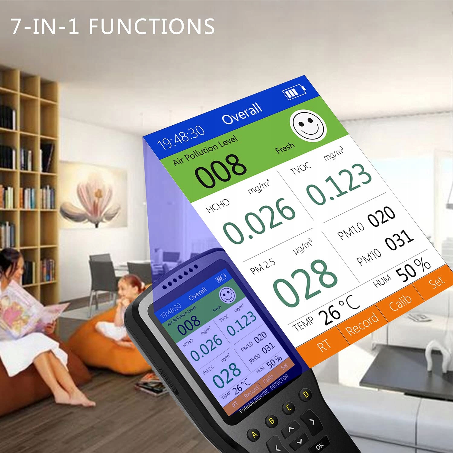 - Багатофункціональний та високоякісний монітор: доступний для 8 типів даних. Повний контроль якості повітря - HCHO / TVOC / AQI / TEMP / HUM / PM2.5 / PM1.0 / PM10 / щоб забезпечити здоров'я вашої родини в усіх аспектах. Використовуйте, просто натисніть Wł./AP. Він оснащений РК -дисплеєм цифрового кольору і може забезпечити середнє значення для кожного газу. Це допомагає розпізнати шкідливі HCHO та TVOC у вашій кімнаті в режимі реального часу. Якщо нормальне значення перевищено, тривога детектора і колір інтерфейсу користувача, щоб уникнути ризику.