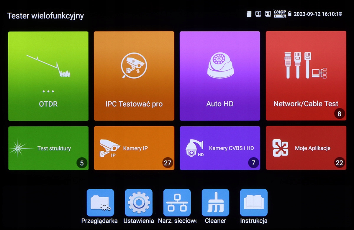 Оптичний рефлектометр (OTDR) Тест камери AHD Тест камери HD-CVI Тест камери HD-TVI Тест камери PAL/NTSC Тест IP-камери - Підтримувані методи стиснення зображення: H.265, H.264, MJPEG Пошук і попередній перегляд Onvif-сумісних IP-камер Керування вертушками та PTZ камерами (швидкісні купольні) Перегляд з IP-камер за допомогою вбудованих додатків - DH test tool, Hik test tool, UNV Test Tool, HuaWei Tool, TP-Link tool