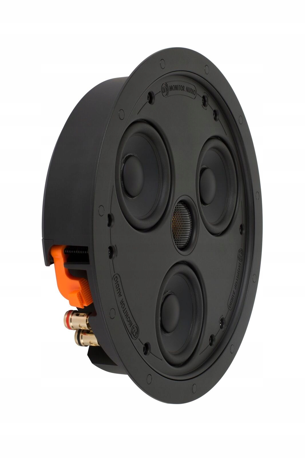 Настінний/стельовий гучномовець Monitor Audio CSS230, призначений для монтажу врівень із білою круглою решіткою, яку можна пофарбувати в будь-який колір