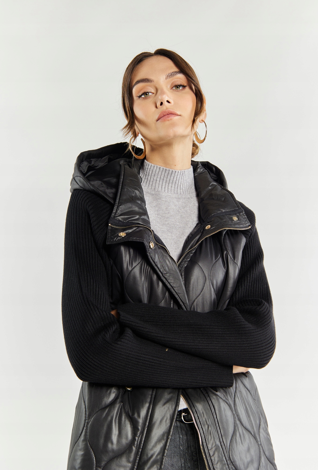 4 Светр з довгими рукавами, капюшоном та кишенями. На лінії талії є манжети, які дозволяють ідеально відповідати светрі з фігурою, підкреслюючи її форму. Ця модель чудово підходить для більш прохолодних днів. Модель на малюнку висотою 177 см і представляє розмір p.Параметри продукту: