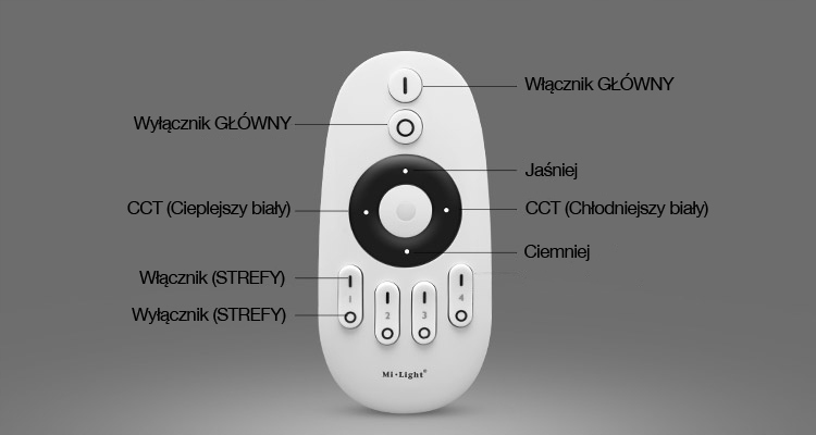 Пульт дистанційного керування дозволяє плавно регулювати яскравість і колірну температуру білого світлаза допомогою 4-позиційних кнопок. Пульт працює в 4-х зонній системі.