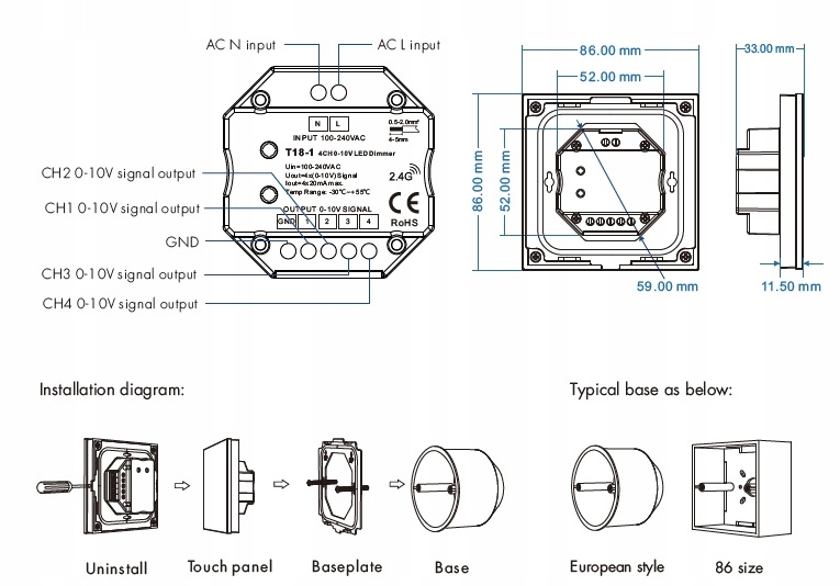 Сучасний диммер 0-10В у вигляді сенсорної світлодіодної панелі, що монтується в настінну монтажну коробку і призначений для роботи з джерелами живлення з функцією диммування 0/1-10В. Цей контролер затемнення призначений для регулювання яскравості монохроматичного освітлення, наприклад, світлодіодних стрічок. Світлодіодна панель T18-1W дозволяє керувати чотирма зонами освітлення, крім регулювання яскравості дозволяє вмикати/вимикати світло. Зв'язок з пристроєм може відбуватися по дроту або по радіо 2,4 ГГц. Перевагою панелі є живлення безпосередньо від мережі змінного струму 230В. Пропонована панель характеризується сучасним покриттям із надчутливою білою скляною панеллю. Гарантія 5 років.