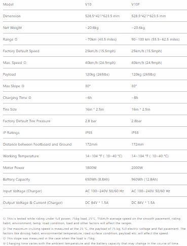 2) Максимальна крейсерська швидкість вимірюється при 25°C, корисне навантаження 75 кг, повна електрична напруга та плоска поверхня. Такі фактори, як звички водіння, температура навколишнього середовища, стан дорожнього покриття, корисне навантаження тощо, впливатимуть на швидкість.