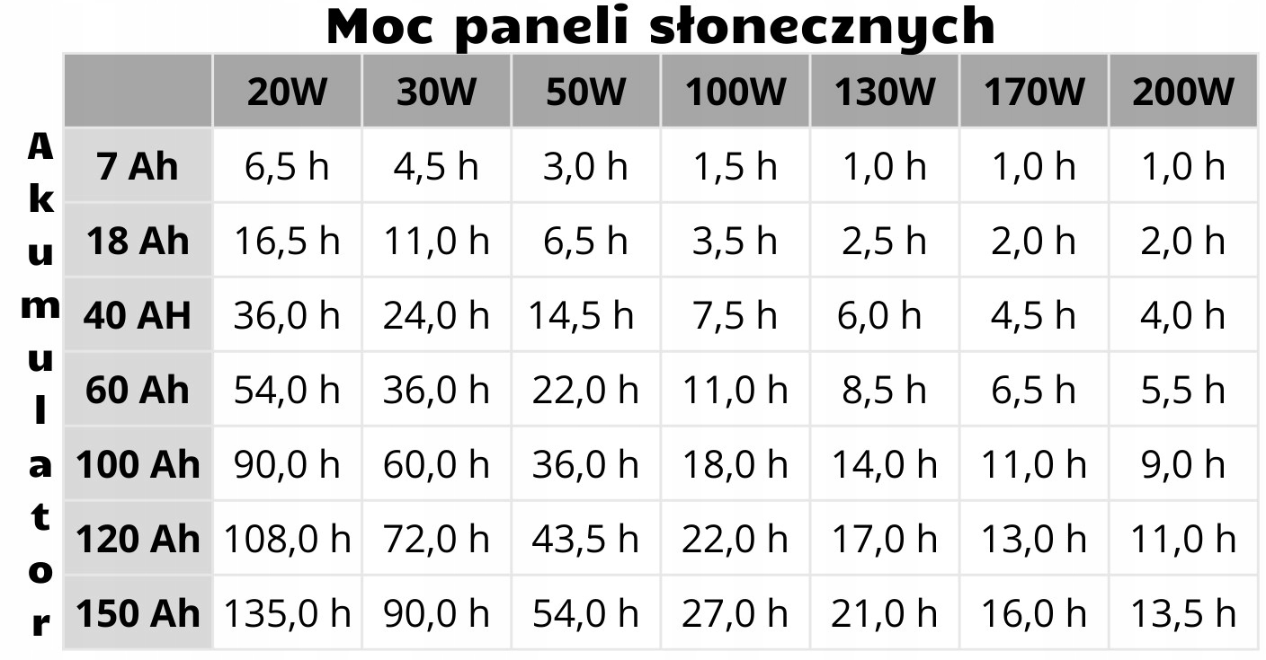 Таблиця представляє приблизні часи зарядки акумулятора залежно від потужності сонячних батарей. На фактичний час зарядки впливають фактори: