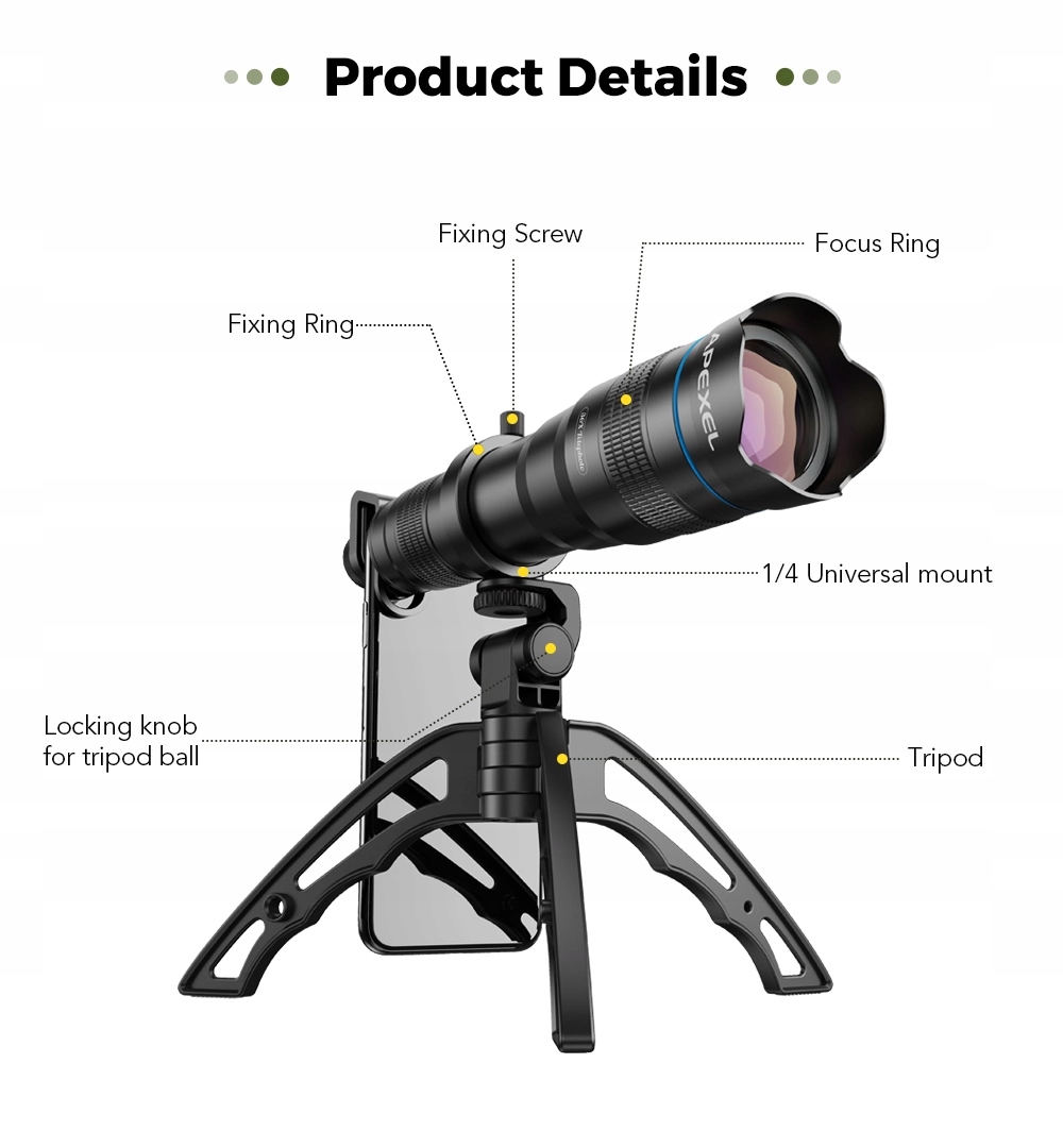 - Високий оптична якість - APL-36XJJ04 - це унікальна лінза зі збільшенням 36x. Використовує високоякісні оптичні скляні лінзи. Забезпечити високоякісна мобільна фотографія.