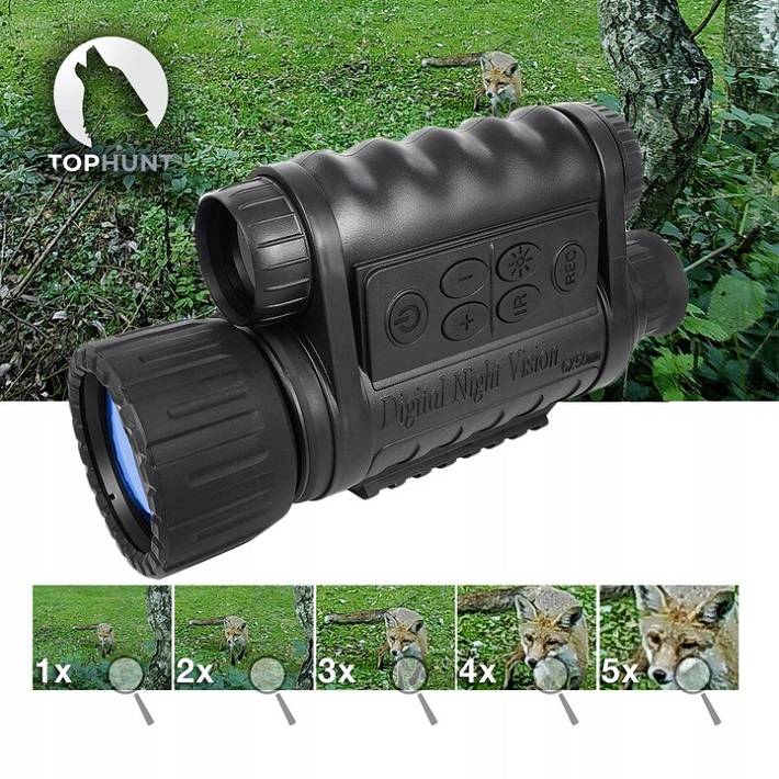 Завдяки використанню цифрової технології прилад нічного бачення TOPHUNT WG-50 забезпечує точне та ефективне спостереження за будь-яких умов, навіть при слабкому освітленні або в повній темряві. Він оснащений матрицею високої роздільної здатності CMOS 5Mpix, завдяки чому яскраві джерела світла і зміни рівнів яскравості не впливають на якість отриманого зображення. Високоякісний об'єктив 50 мм з постійним 6-кратним оптичним збільшенням і 5-кратним цифровим зумом дозволяє збільшувати зображення без істотних втрат. Завдяки цьому прилад нічного бачення буде придатним для таких застосувань, як: