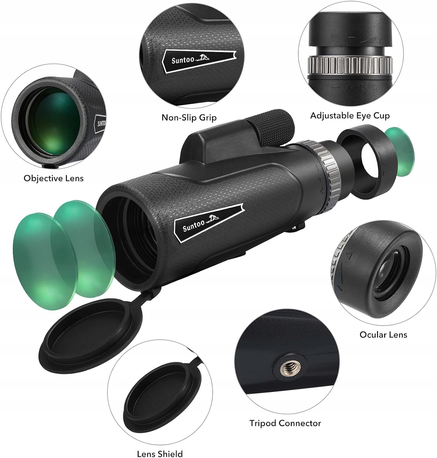 - 10 x 50 HD: збільшення монокулярного телескопа Suntoo становить 10x. Діаметр окуляра: 23 мм, отвір об'єктива - 50 мм; поле зору: 5,6. Плюс-мінус 5%, відстань до вихідної зіниці: 12,8 мм, лінза K9, лінза з повним багатошаровим покриттям для забезпечення відмінної світлопроникності та яскравості, світлопроникність до 99,5%.