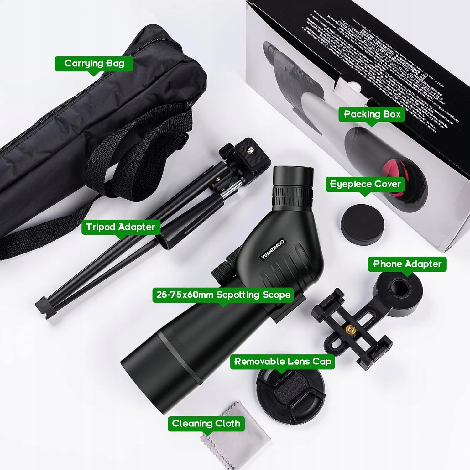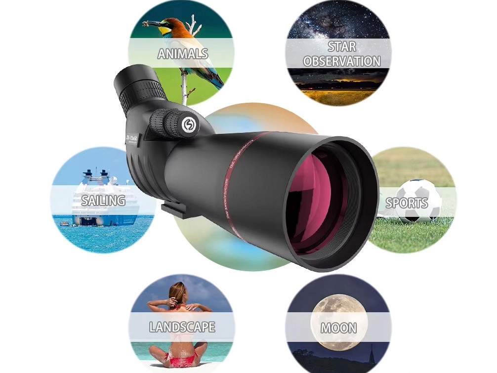 регульоване, сильне збільшення 25-75x та потужний об'єктив 60 мм дозволяє відстежувати ціль і збільшити її для отримання більш детальної інформації. Ідеально підходить для зйомки на ціль, полювання, спостереження за птахами, блуканням, спостереженням зірок, подорожей, спорту тощо